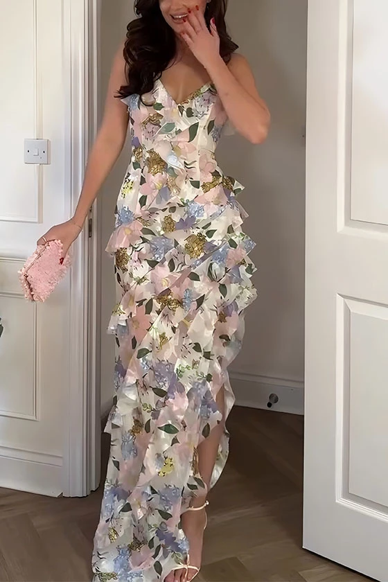 Cami Strap Floral Print High-Low Skirt Dress