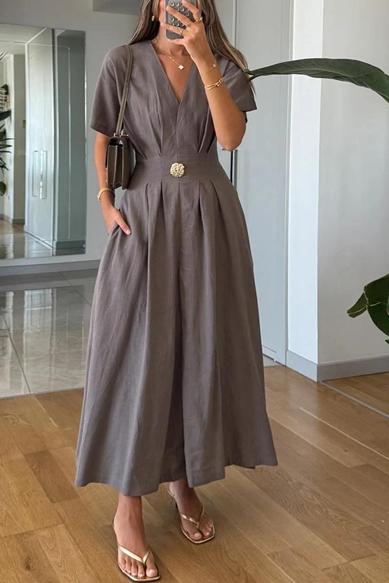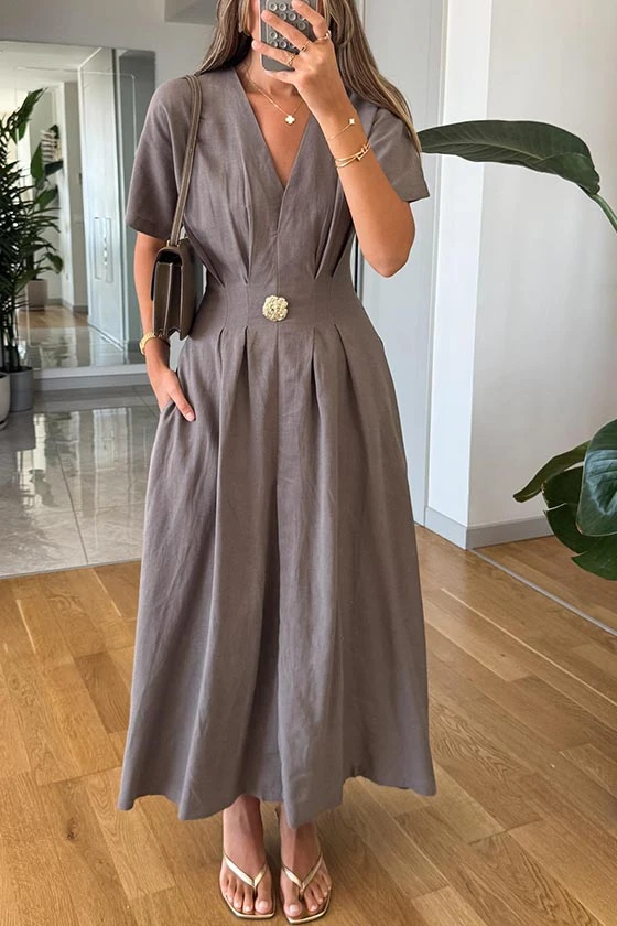 Gold Buttoned Linen Midi Dress