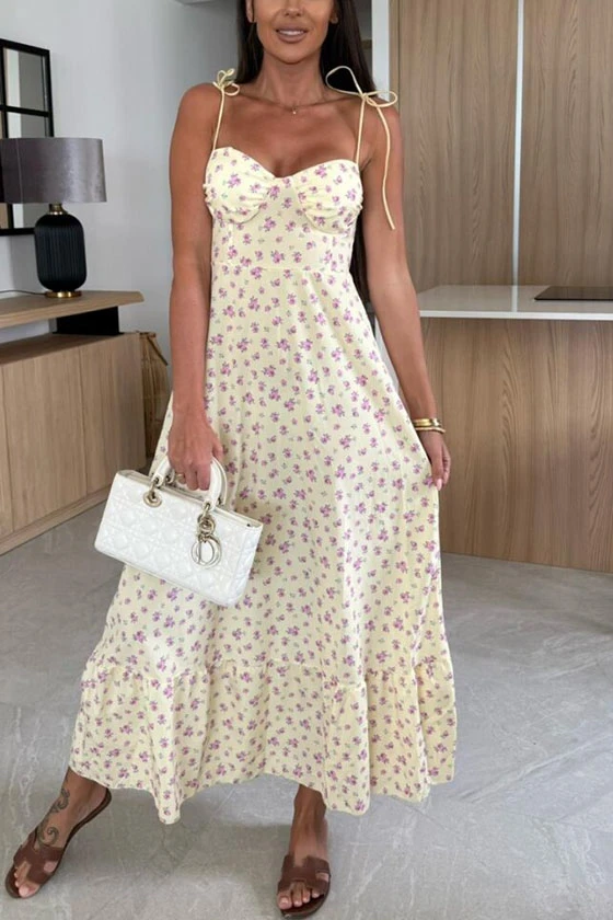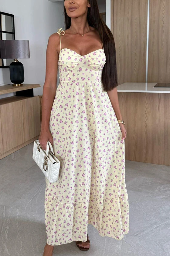 Floral Print Maxi Dress with Bow Tie Shoulder Straps