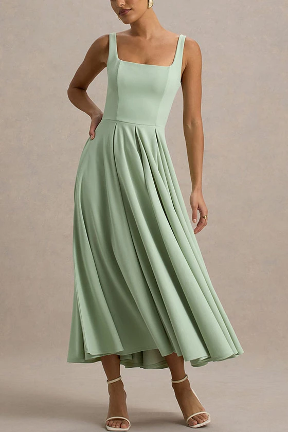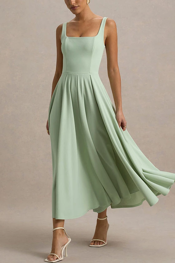 Sleeveless Pleated Dress with Spaghetti Straps and Square Neck