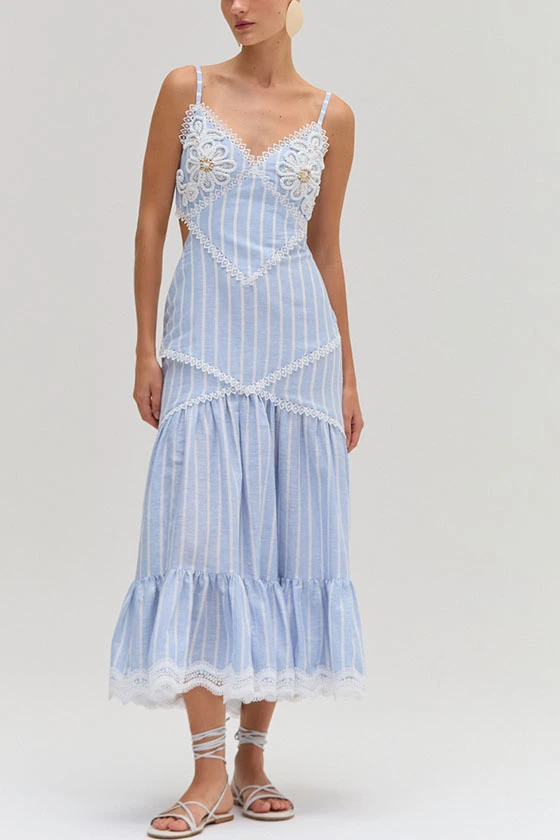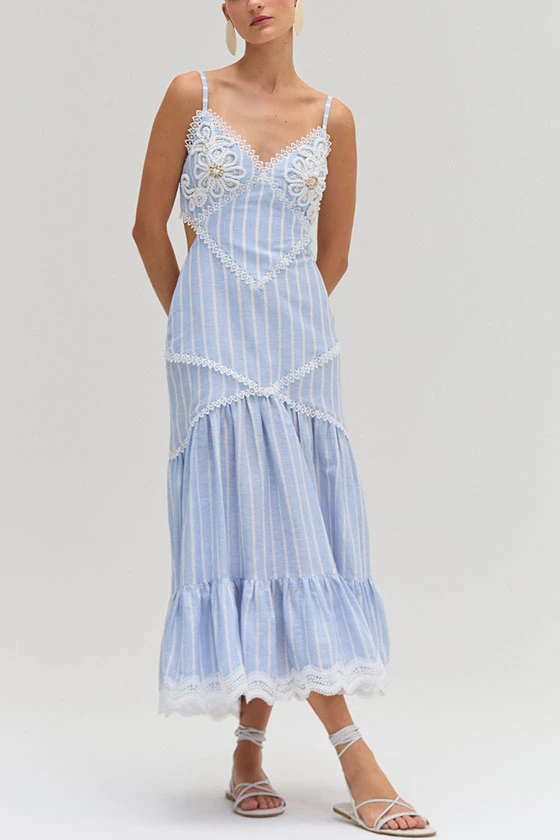 Blue and White Striped Spaghetti Strap Dress with Lace Trim
