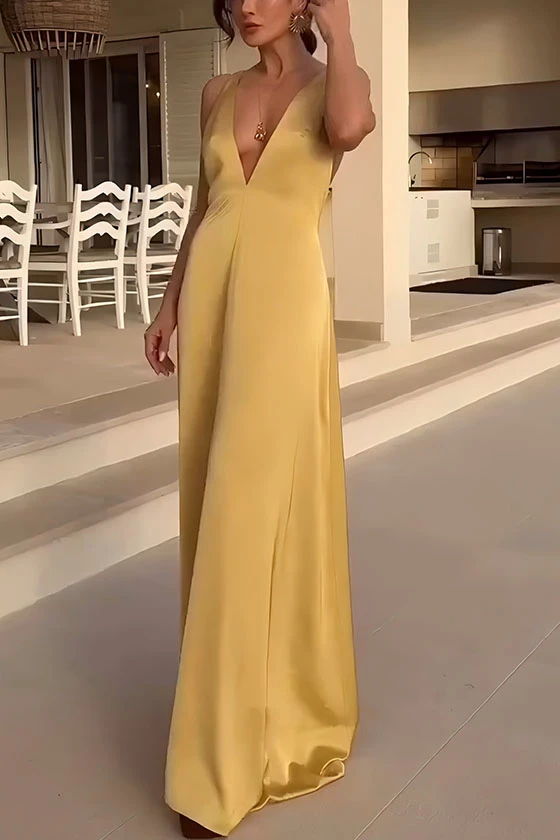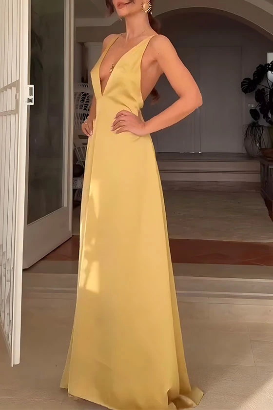 Elegant Yellow Sleeveless Deep - V Maxi Dress