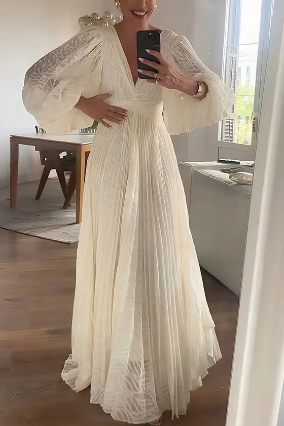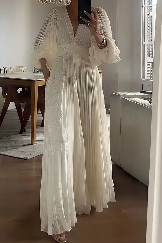 Elegant Beige Deep V - neck Lantern Sleeves Maxi Dress