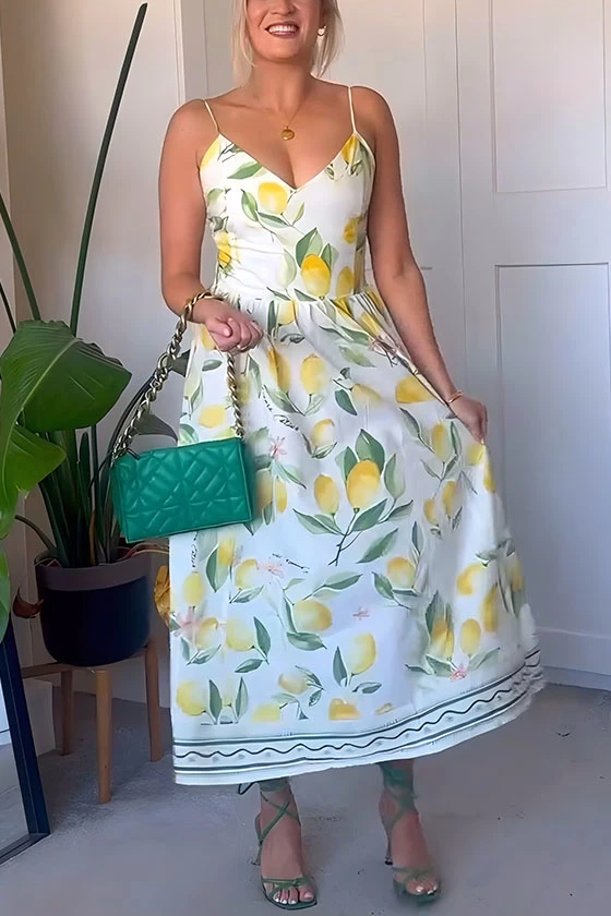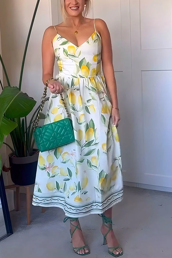 V - Neck White Lemon Print Spaghetti Strap Midi Dress