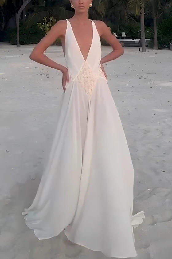 Elegant White Deep V - Neck Sleeveless Maxi Dress with Embroidered Detailing