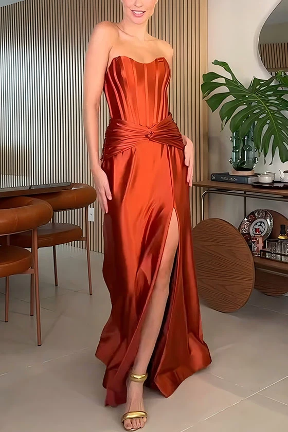 Luxurious Red Silk Strapless Corset Maxi Dress with High Slit
