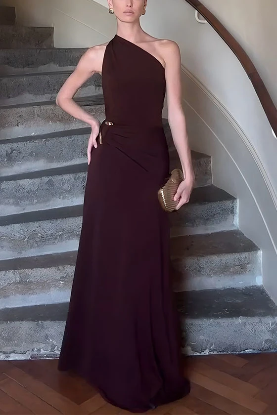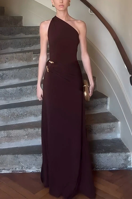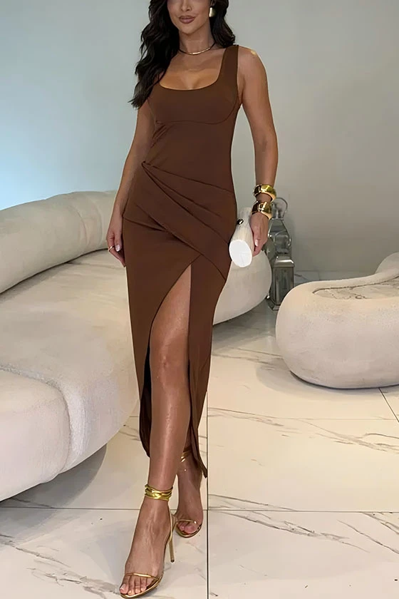 Sleek Brown Square Neck Bodycon Midi Dress with Asymmetrical Slit