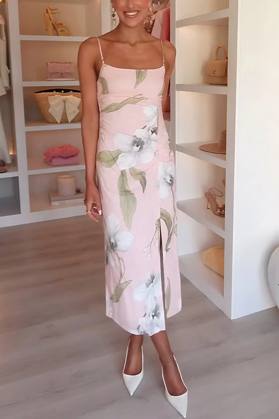 Romantic Pink Floral Spaghetti Strap Midi Dress with Slit