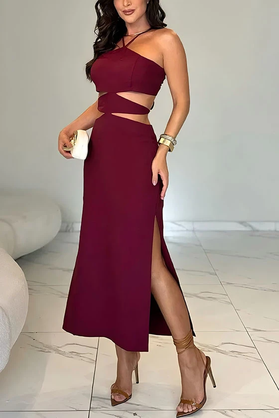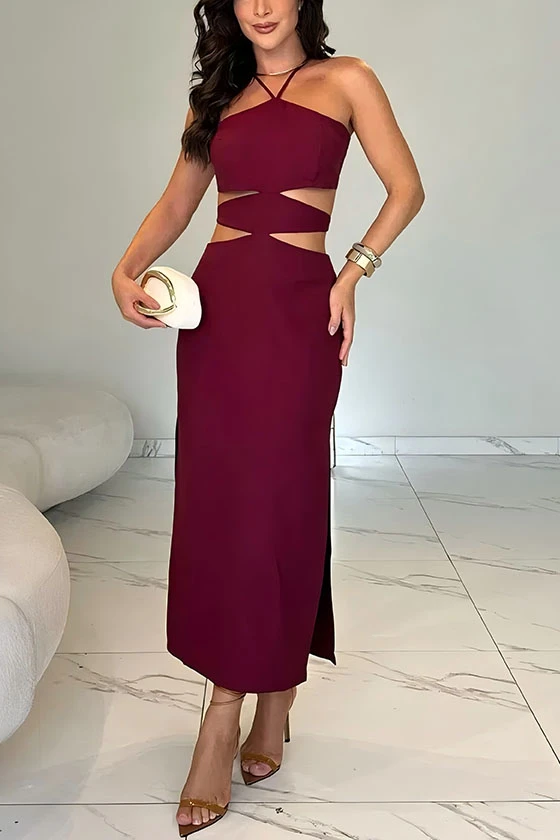 Chic Burgundy Cut-Out Halter Bodycon Midi Dress with Side Slit