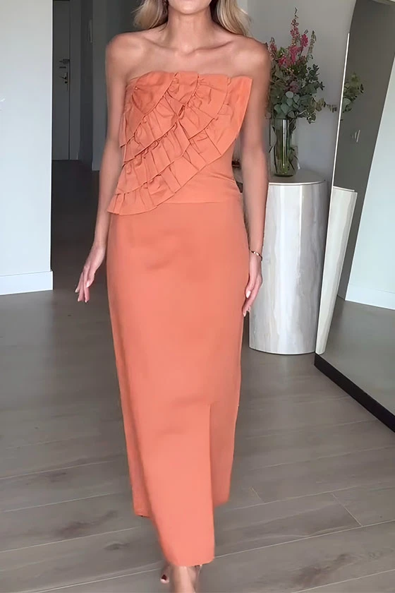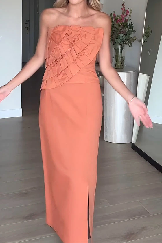 Strapless Ruffled Maxi Dress with a Leg Slit