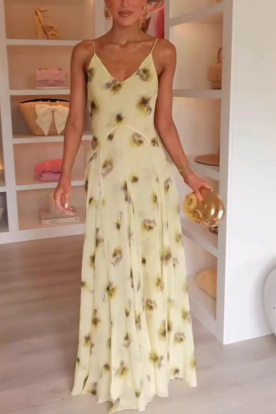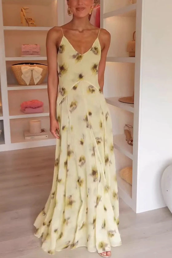Printed Deep V-Neck Spaghetti Strap Maxi Dress