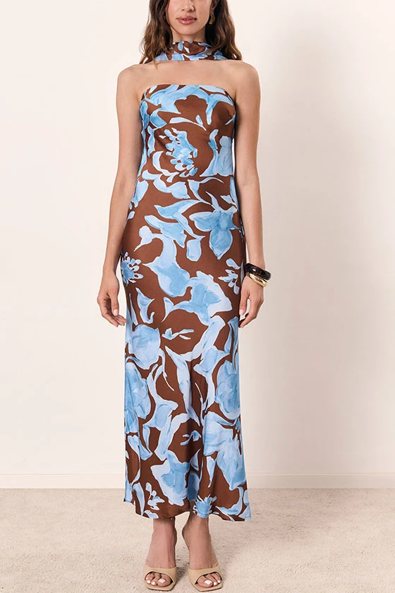 Chic Halter Neck Floral Print Strapless Maxi Dress
