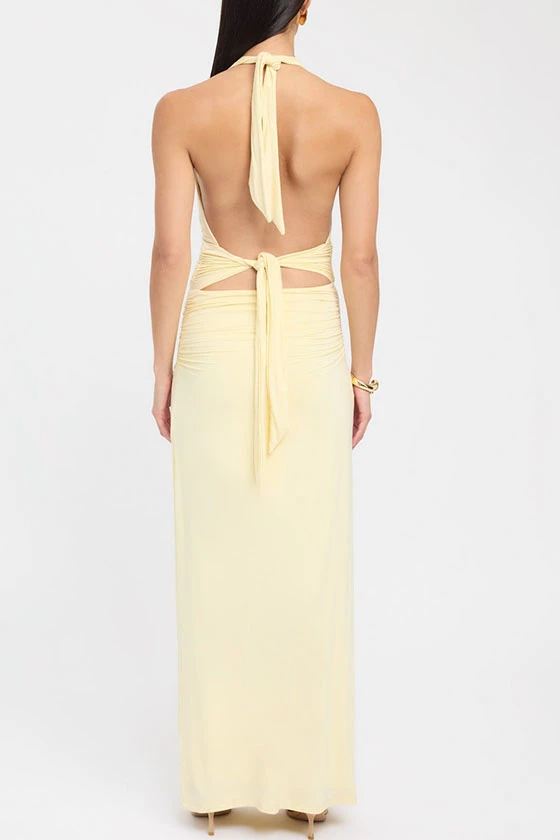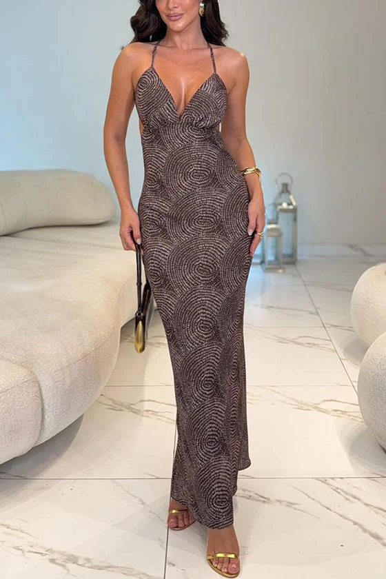 Elegant Deep V - neck Halter Backless Maxi Dress with Spiral Pattern