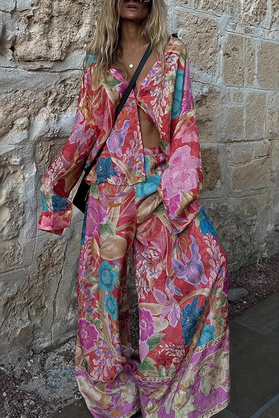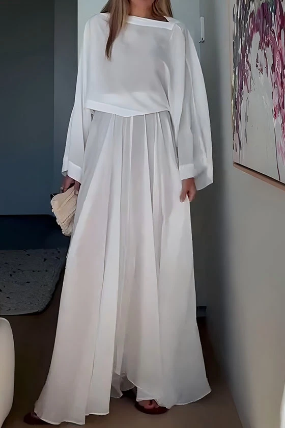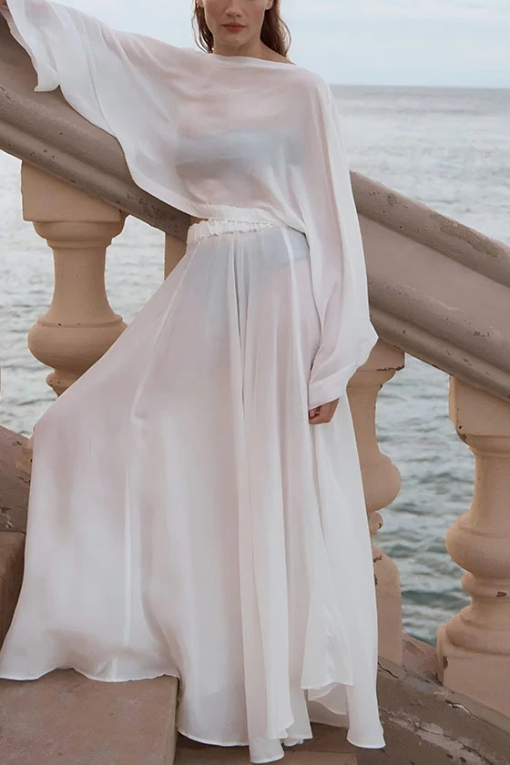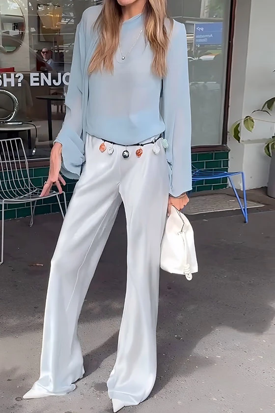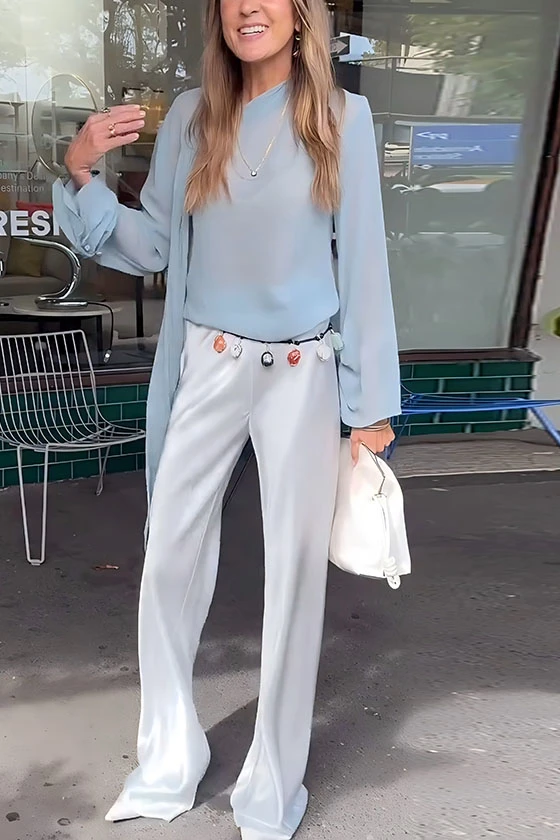 Sheer Chiffon Long Sleeve Top & Satin Wide-Leg Pants Set