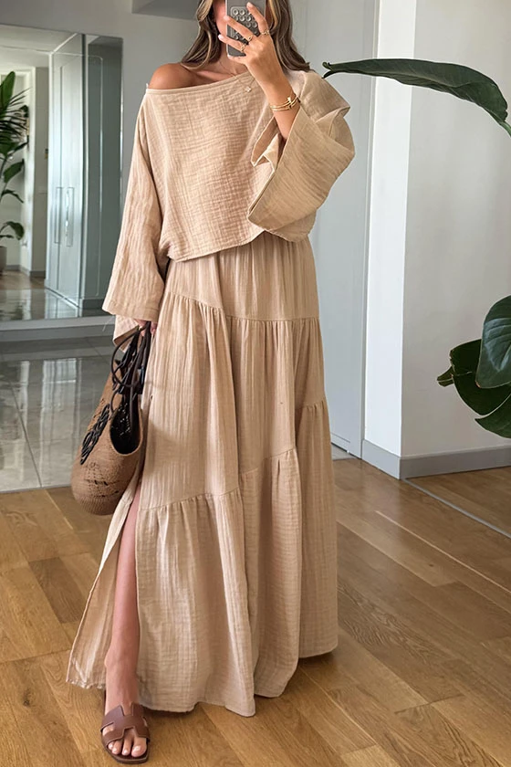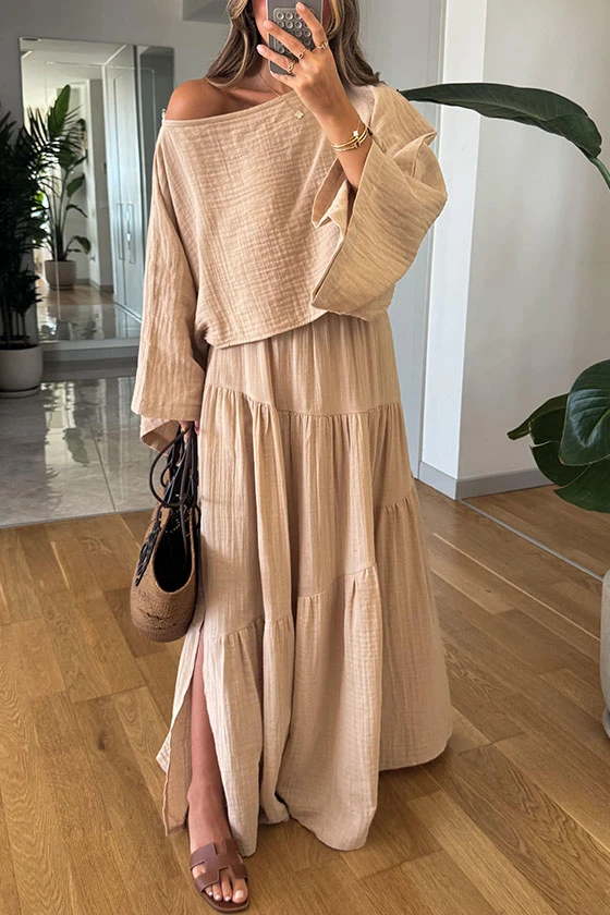 Bohemian Style Off Shoulder Beige Top and Tiered Maxi Skirt Set