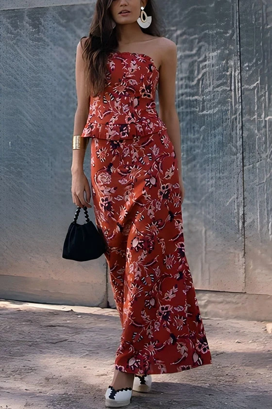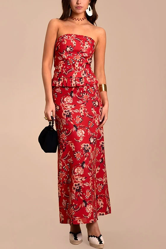 Chic Floral print Strapless Peplum Top & Midi Skirt Set