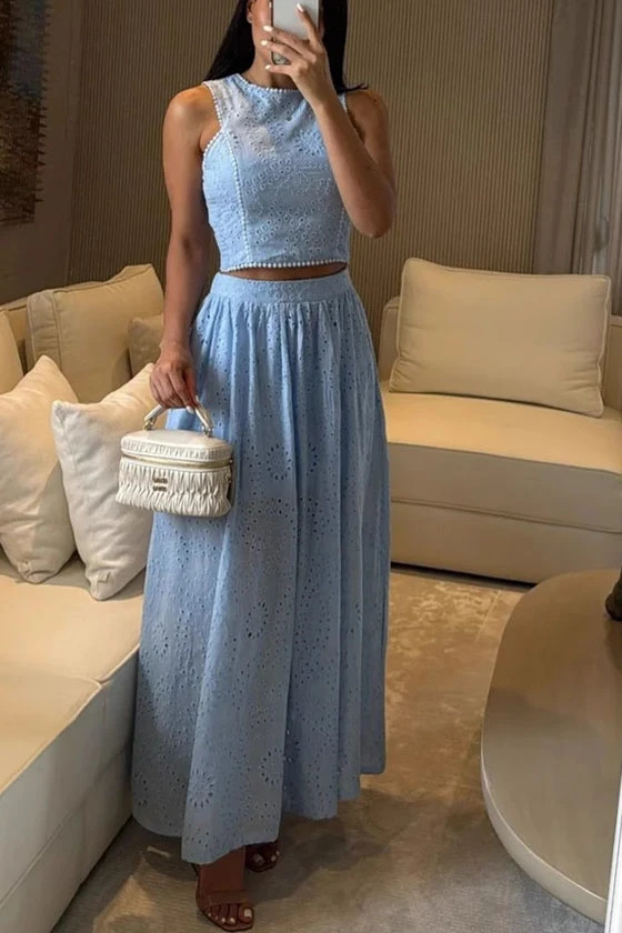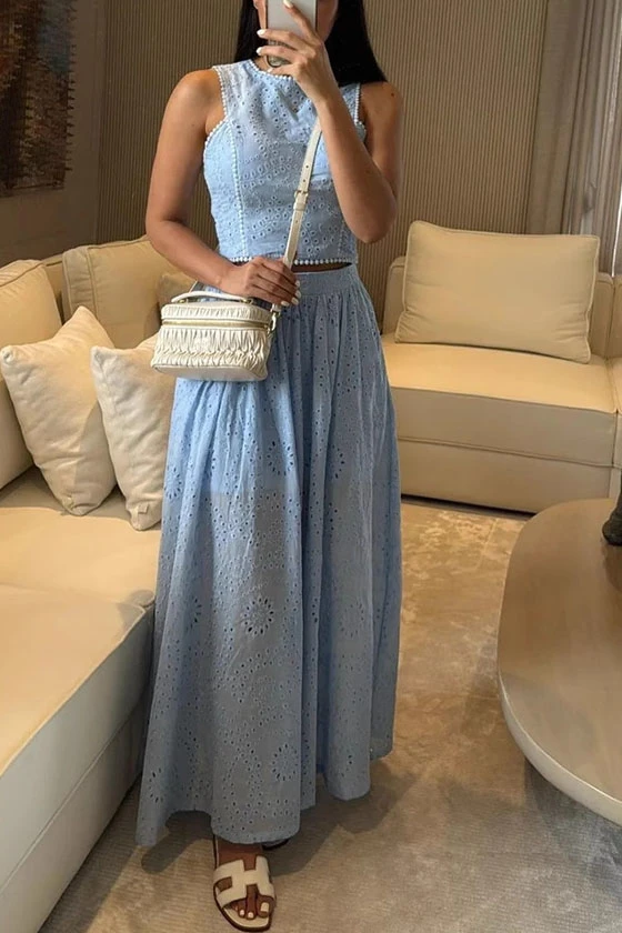 Hollow-out Printed Lace Vest and Skirt Set