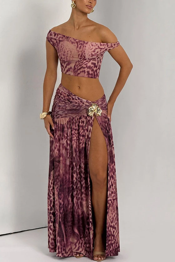 Chic Leopard Print Off - shoulder Crop & Ruched Maxi Skirt Set