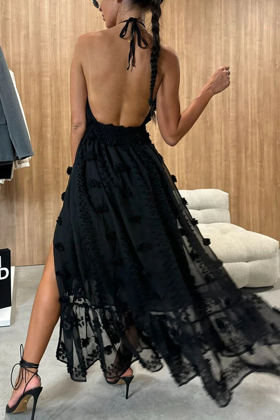 Halter Neck Maxi Dress with Floral Embroidery and Side Slit