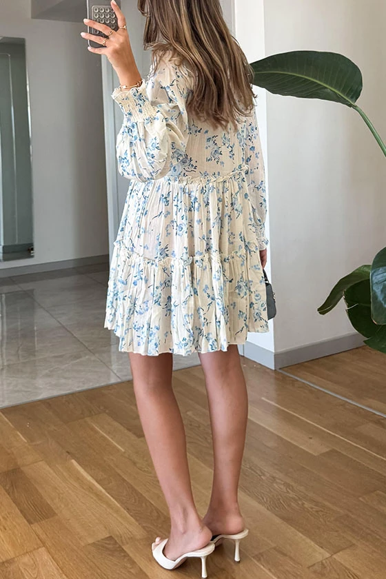 Long Sleeve Floral Print V-Neck Ruffled Tiered Dress