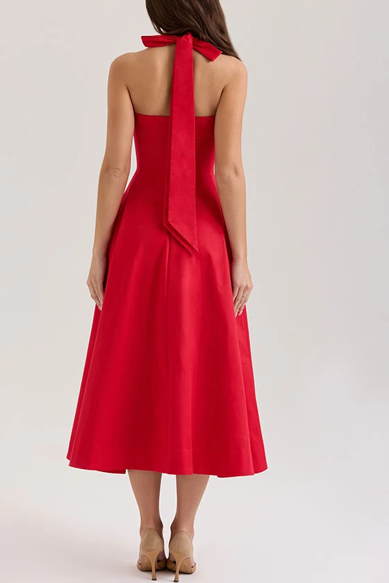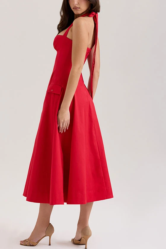 Red Halter Neck Midi Dress with Button Front & Pockets