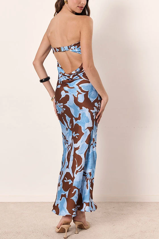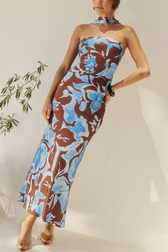 Chic Halter Neck Floral Print Strapless Maxi Dress