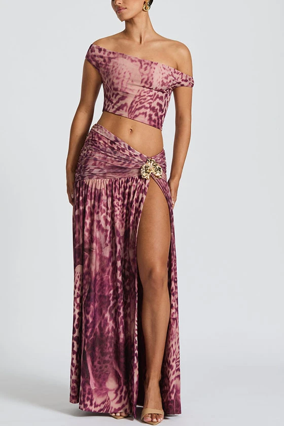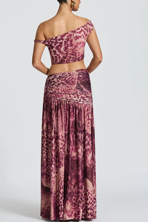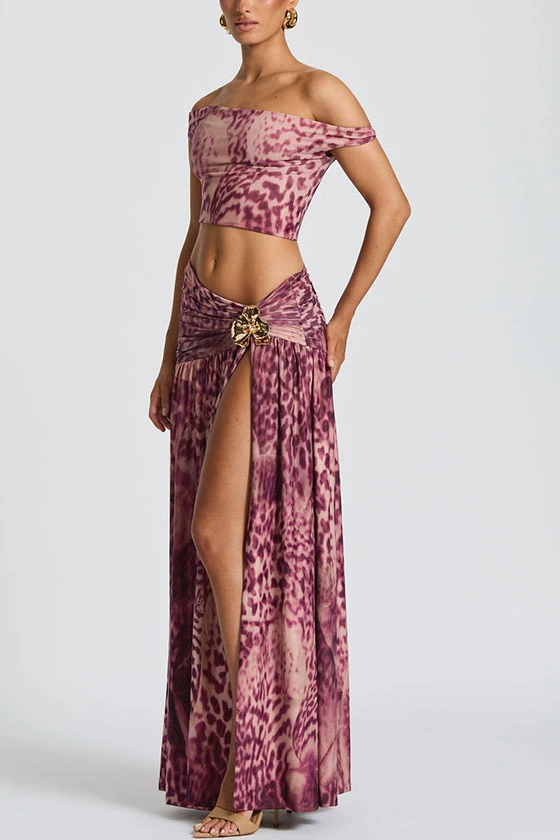 Chic Leopard Print Off - shoulder Crop & Ruched Maxi Skirt Set
