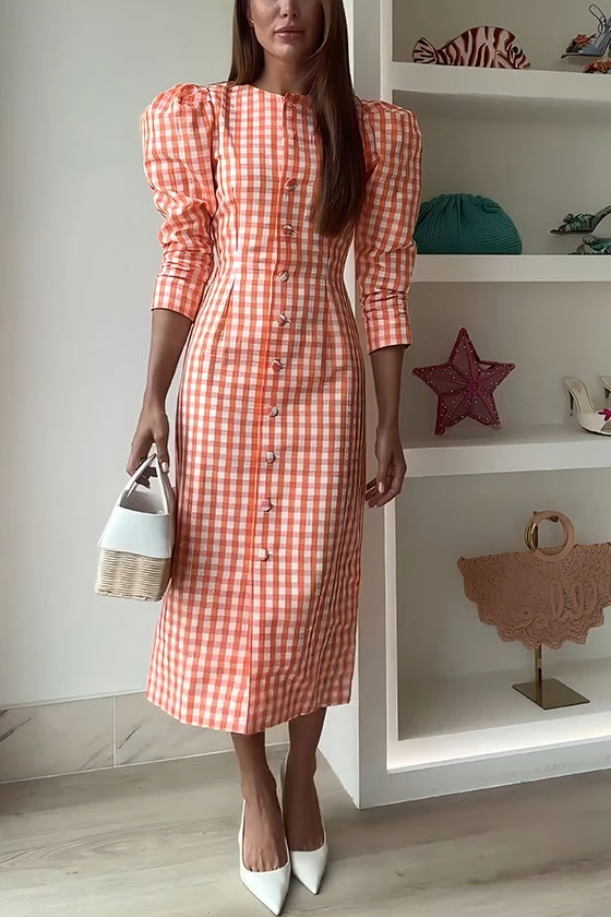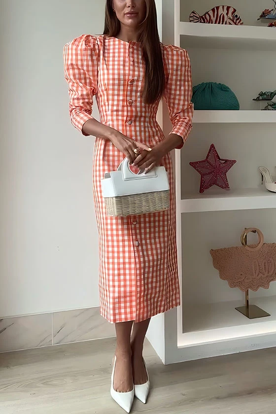 Chic Orange - White Gingham Midi Dress with Puff Sleeves