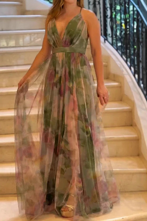 Elegant Halter Neck Floral Pleated Maxi Dress