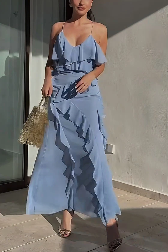 Elegant Spaghetti Strap V-neck Tiered Ruffled Maxi Dress in Light Blue