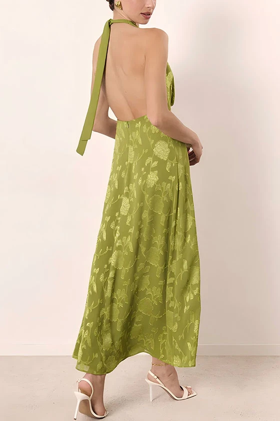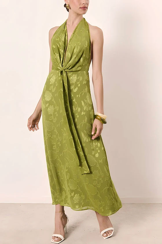 Floral Jacquard Halter Tie Front Midi Dress in Olive Green