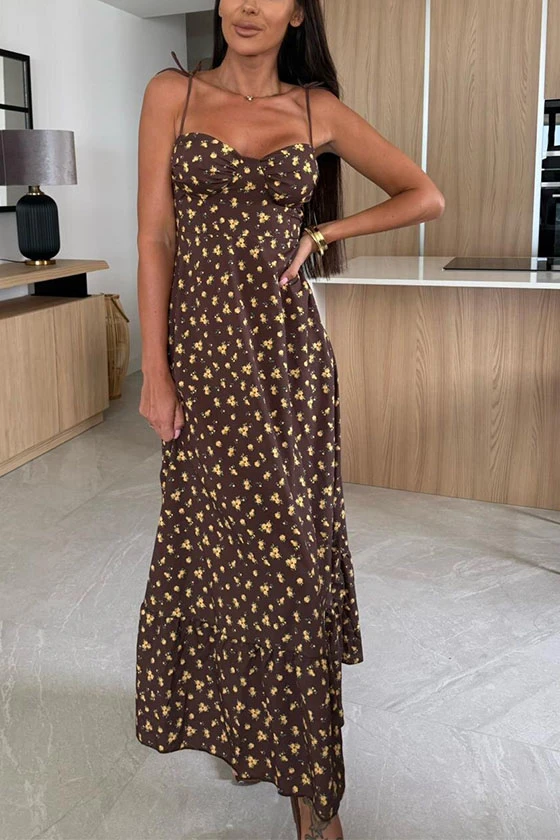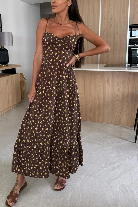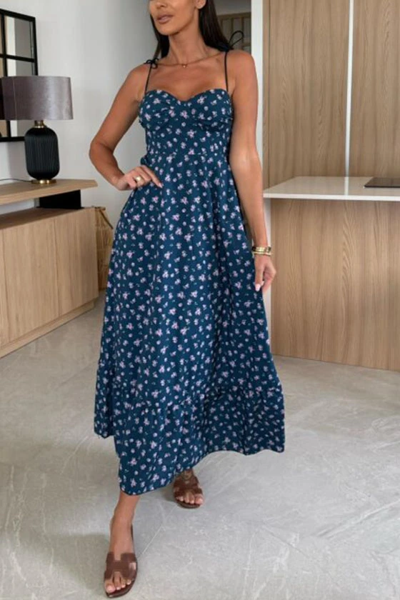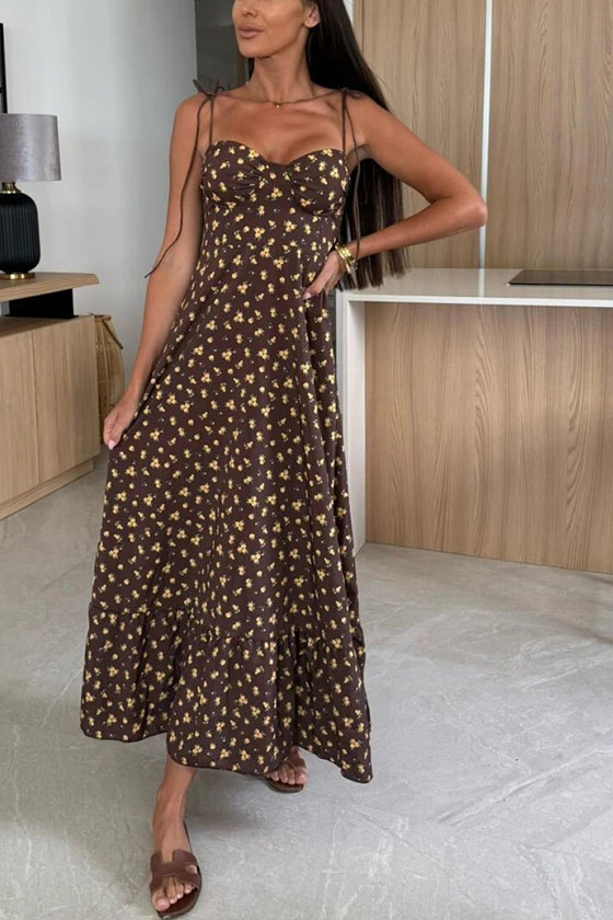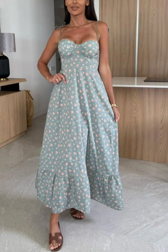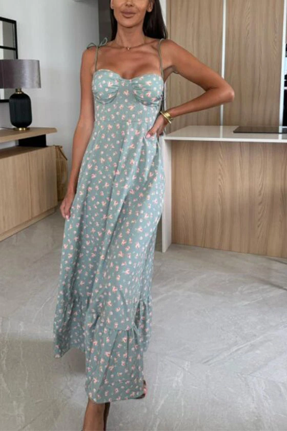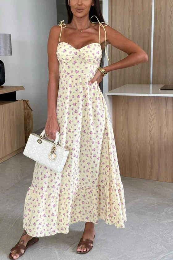 Floral Print Maxi Dress with Bow Tie Shoulder Straps