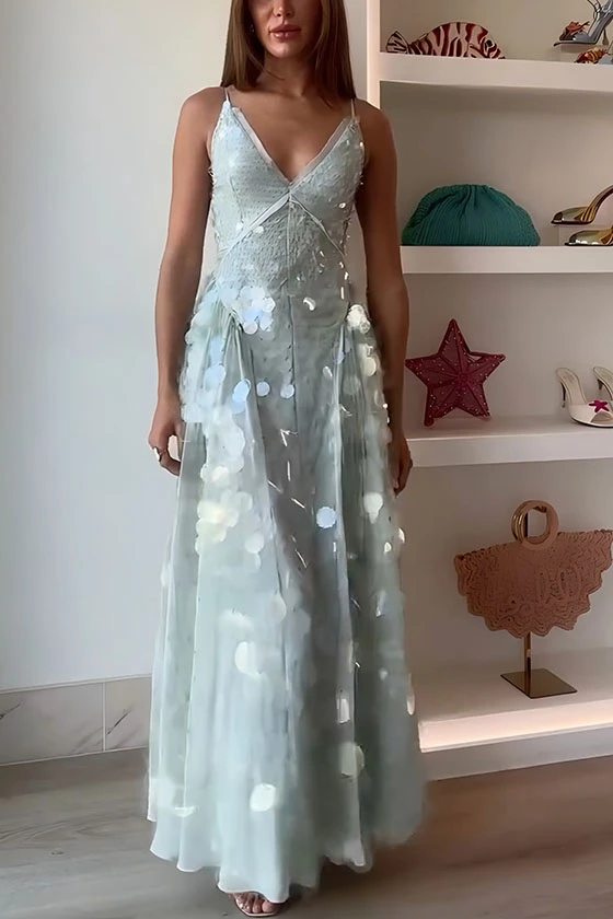 Spaghetti Strap V-Neck Sequin Mesh Maxi Dress