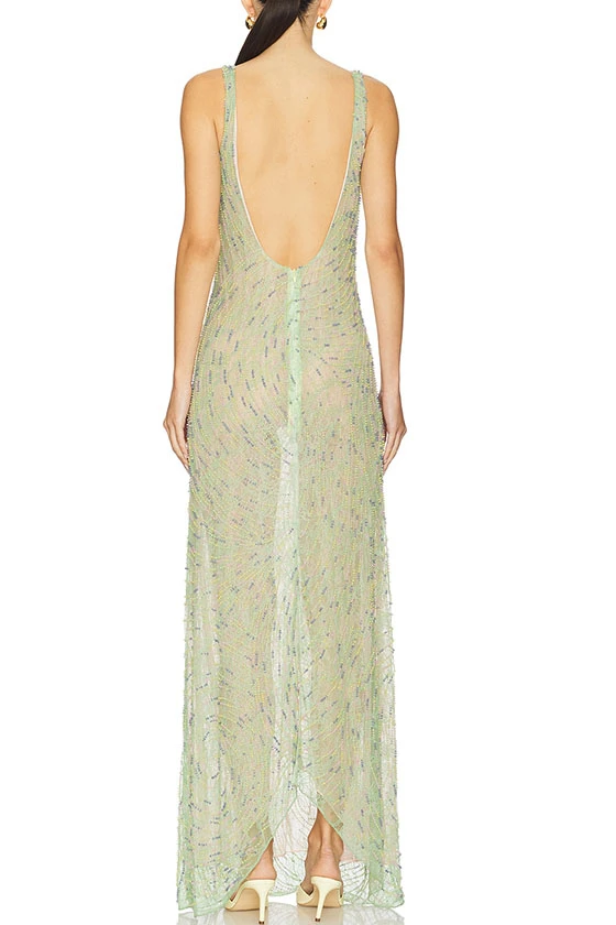 Elegant Beaded Sheer Maxi Dress Sleeveless V Neck Evening Gown
