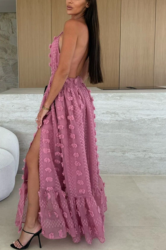 Embroidered Sleeveless Halter Dress with Side Slit